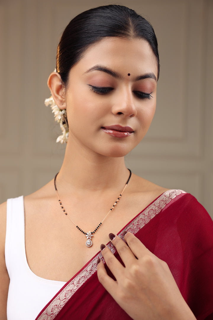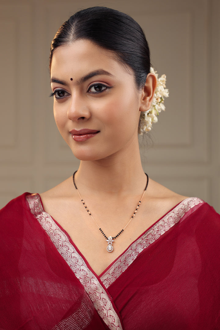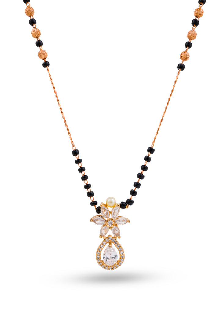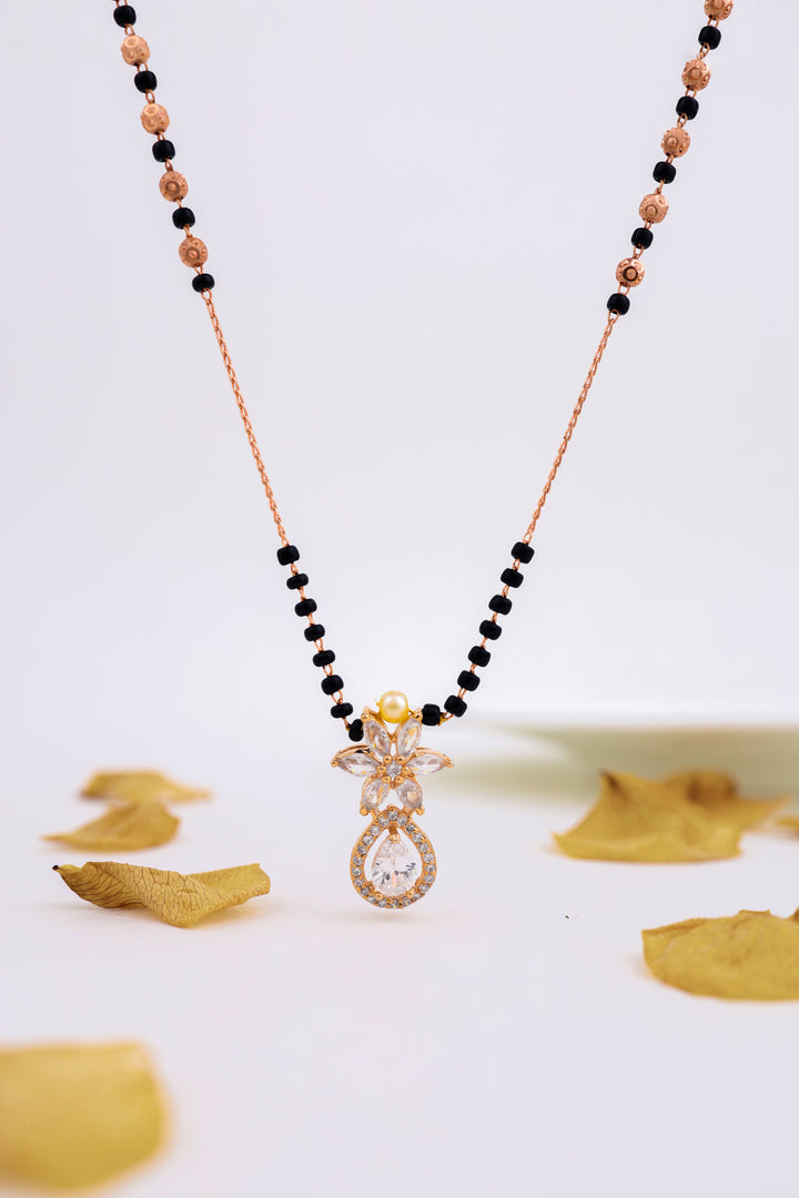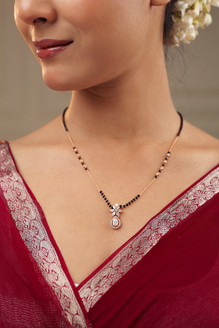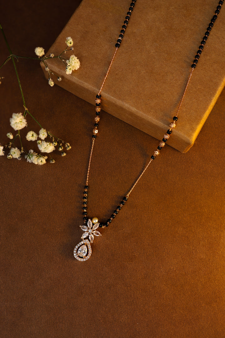 A graceful floral mangalsutra featuring a teardrop diamond-studded pendant with a single pearl accent, set in radiant 20k gold and paired with a dual black-bead chain — symbolizing timeless elegance and modern tradition.