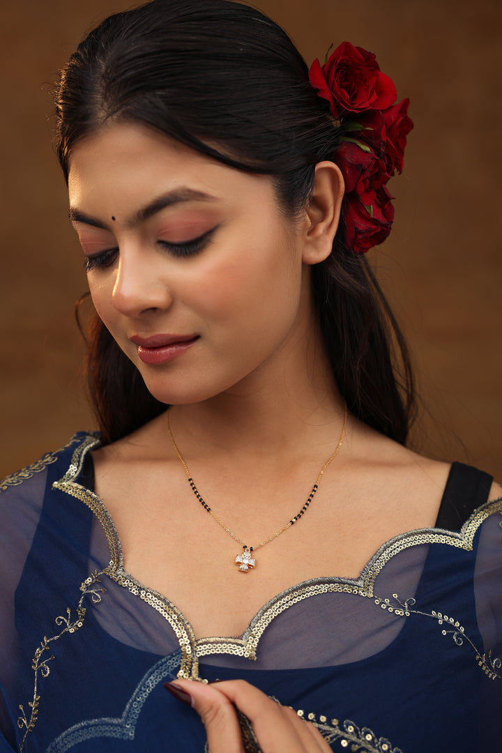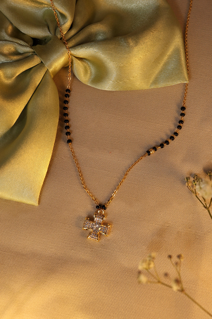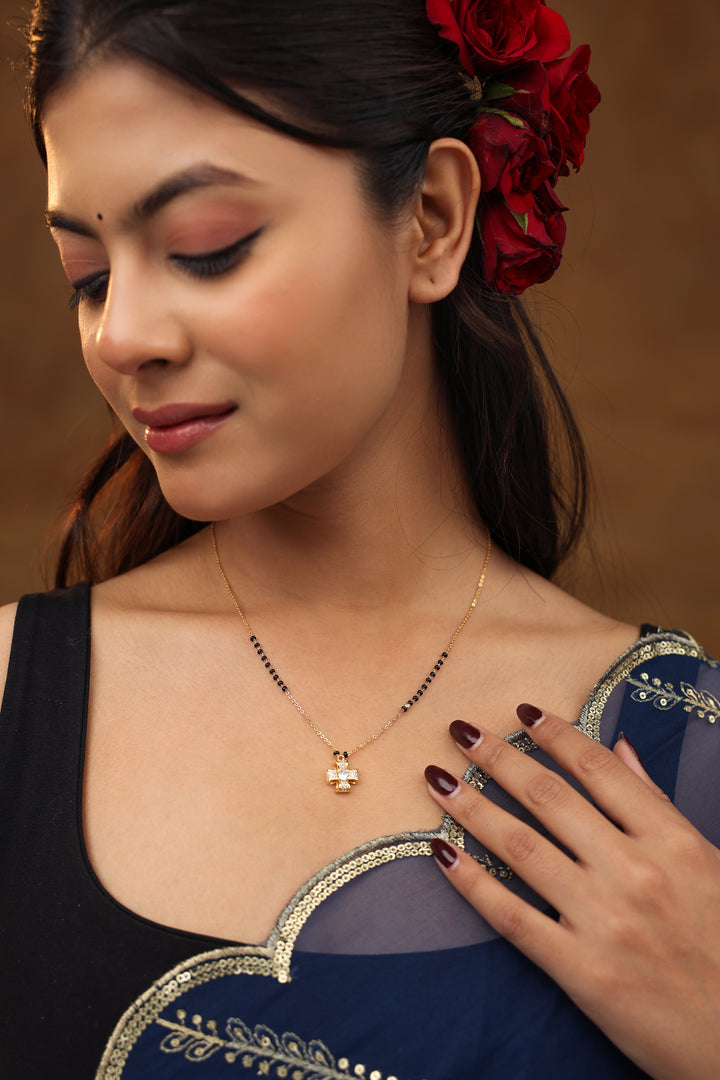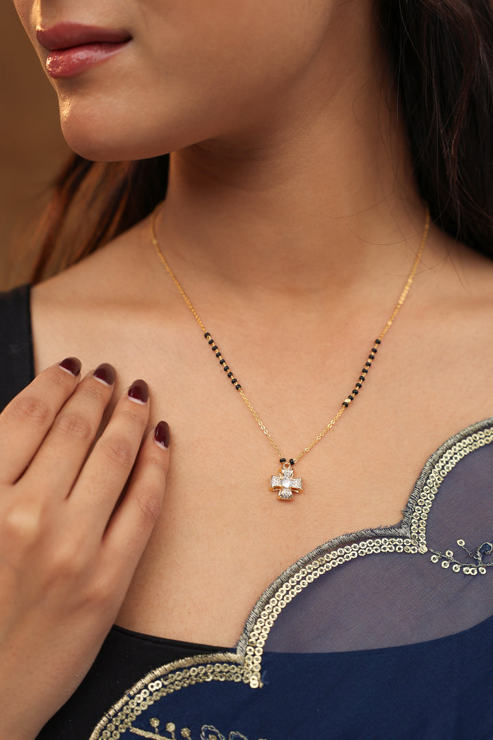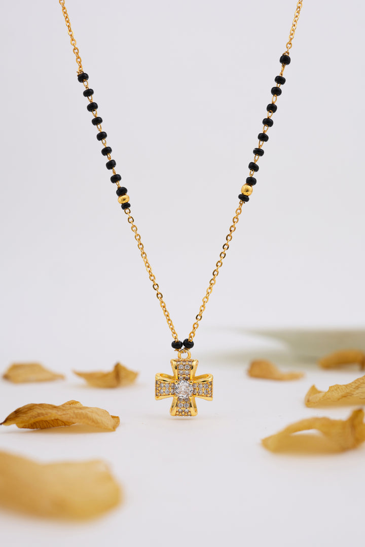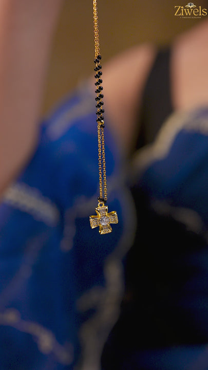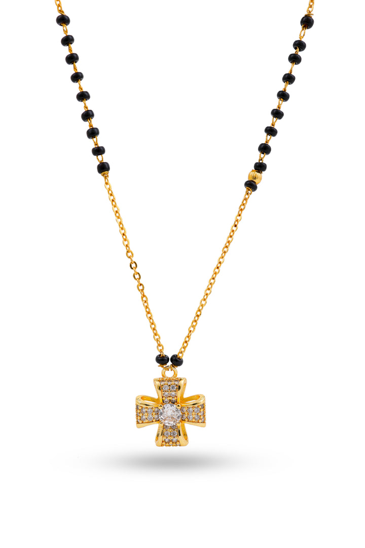 A stylish cross-shaped mangalsutra crafted with shimmering CZ stones and finished in 20K gold plating. Paired with traditional black beads, this elegant piece blends spirituality and modern fashion, making it perfect for daily wear and meaningful gifting.