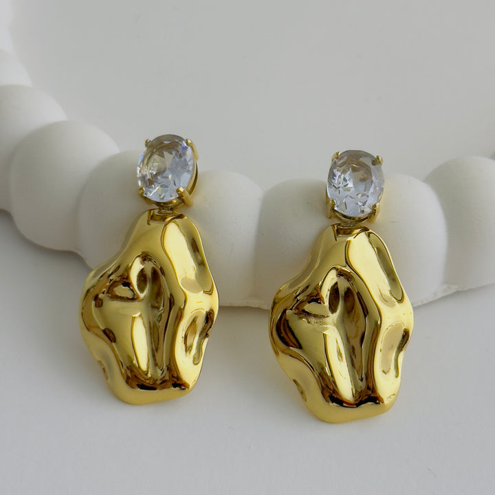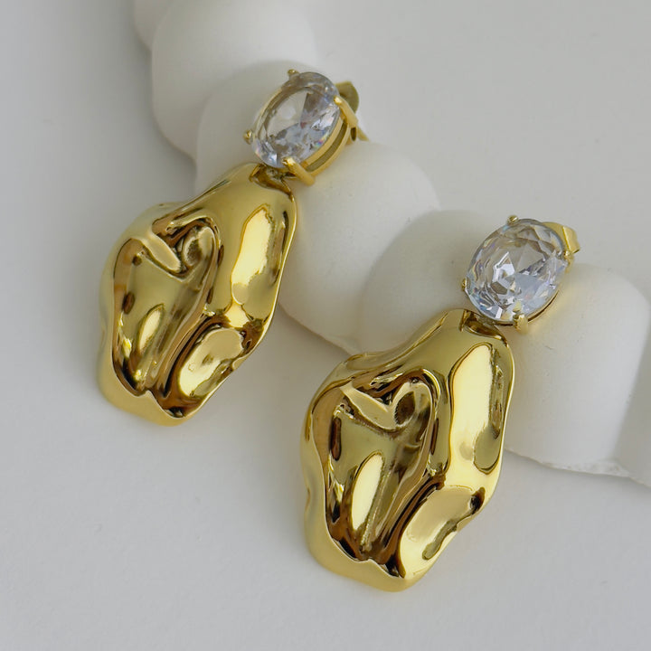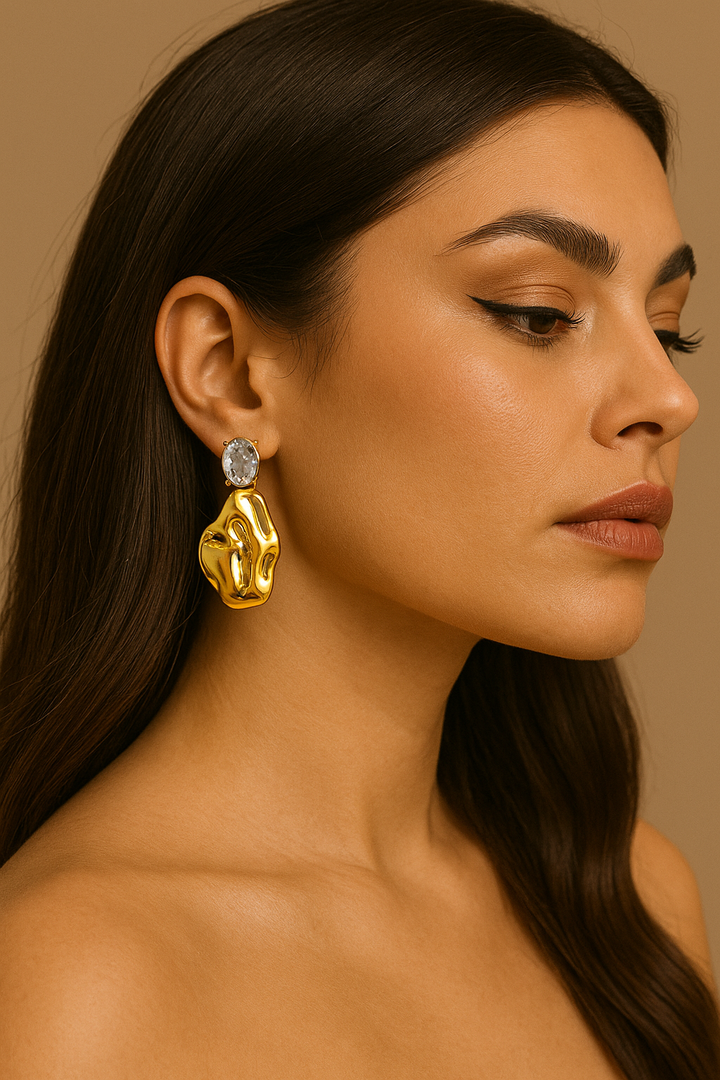 He Aurora Sculpted Gold Drop Earrings by redefine bold elegance with their unique molten-gold inspired design. Crafted with premium anti-tarnish, waterproof, skin-safe 18K gold plating, these earrings feature an abstract, fluid texture that captures light from every angle. At the top, a brilliant-cut crystal stone adds a striking contrast, infusing sparkle and sophistication. Perfect for evening soirées or statement styling, these earrings are designed to turn heads while offering all-day comfort and durability.