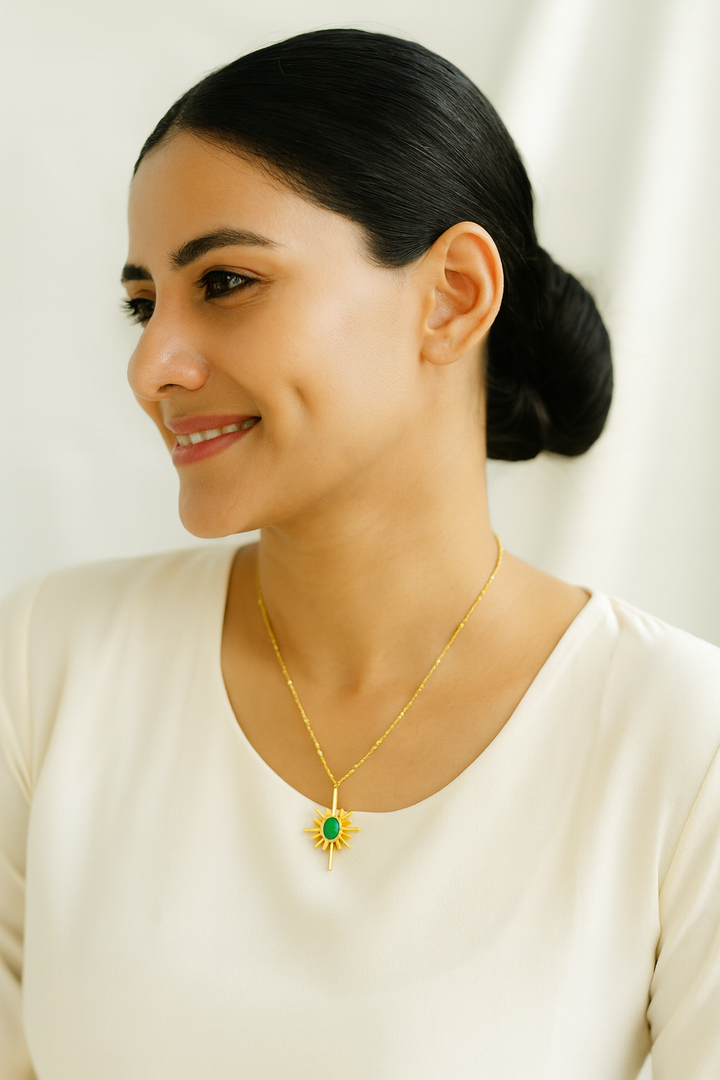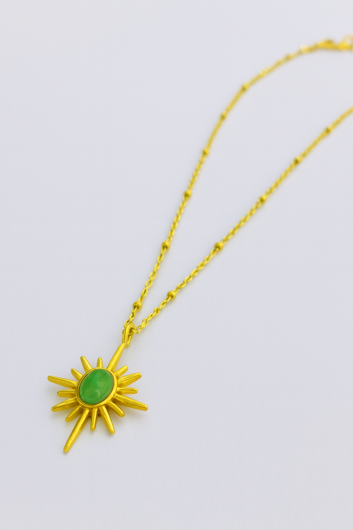 Radiate brilliance with the Emerald Sunburst Necklace, a striking design crafted with 18K gold plating. The pendant features a dazzling sunburst silhouette, centered with a vivid green gemstone that symbolizes renewal, energy, and vitality. Suspended on a delicate gold chain with bead-like accents, this piece beautifully combines elegance with a bold statement. With its anti-tarnish, waterproof finish, it ensures lasting shine and durability, making it perfect for everyday sophistication or special occasions.