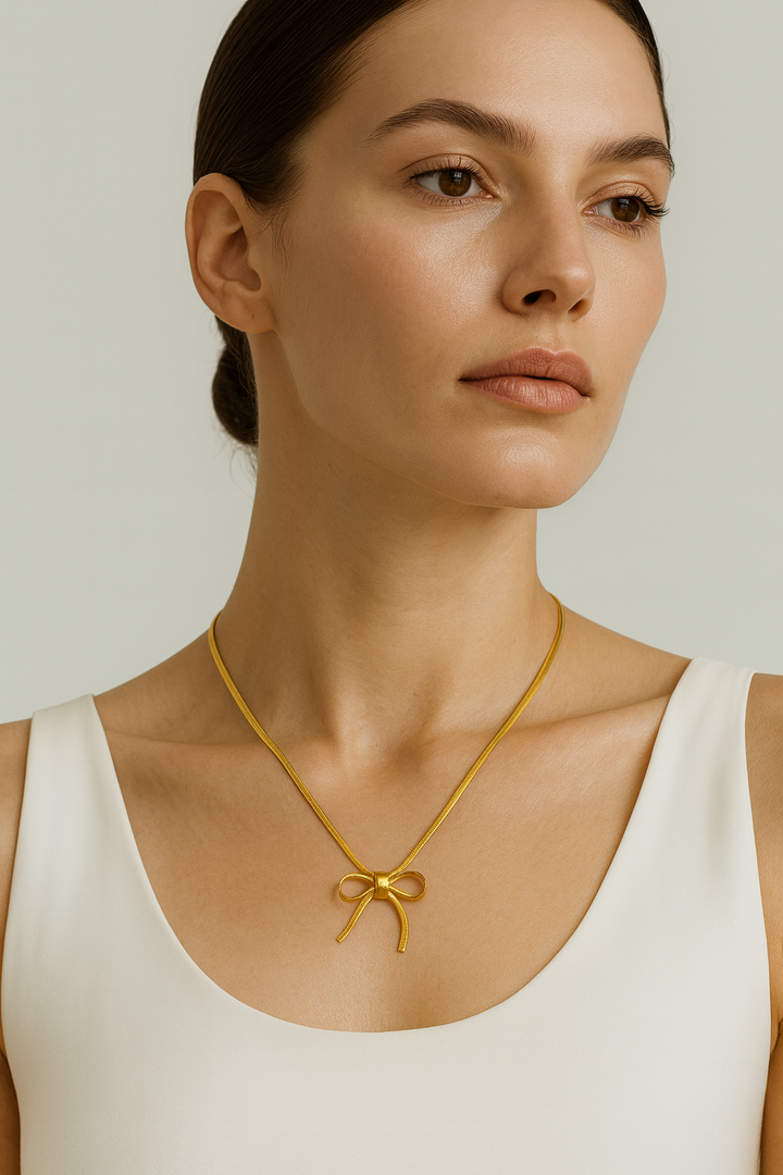 The Golden Bow Charm Necklace is a graceful and feminine piece designed to add a touch of timeless elegance to your look. Crafted with premium 18K gold plating, this necklace features a delicate bow pendant symbolizing love, grace, and sophistication. Suspended on a sleek snake-style chain, it offers a modern yet romantic appeal, making it perfect for both casual chic and evening glamour. With its anti-tarnish, waterproof finish, this necklace ensures durability and everlasting shine.