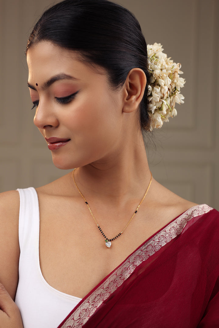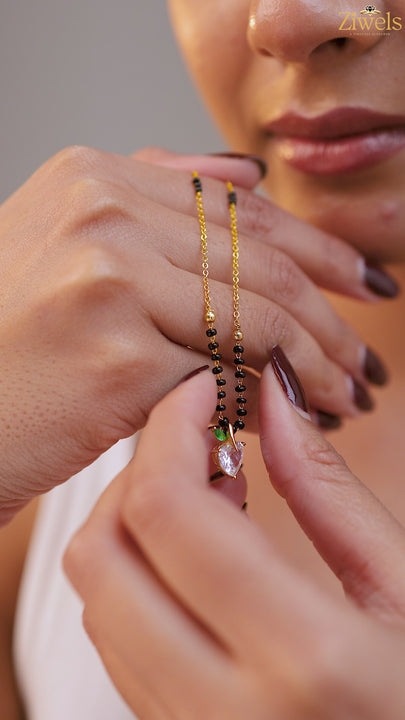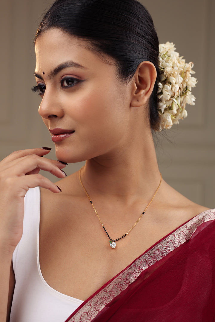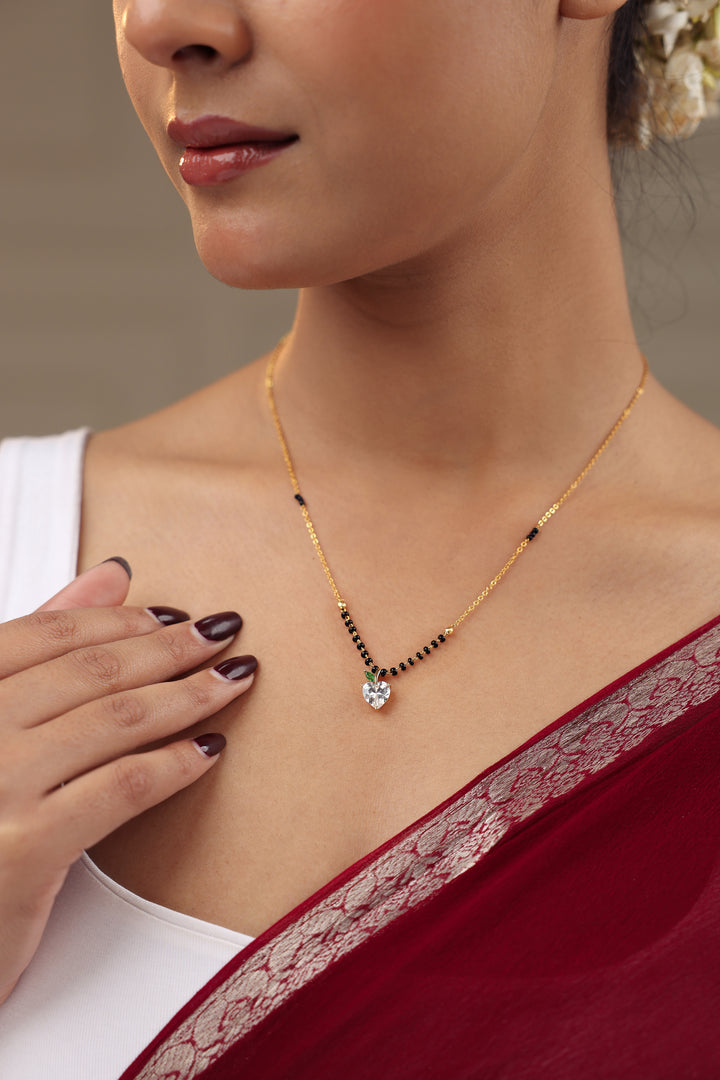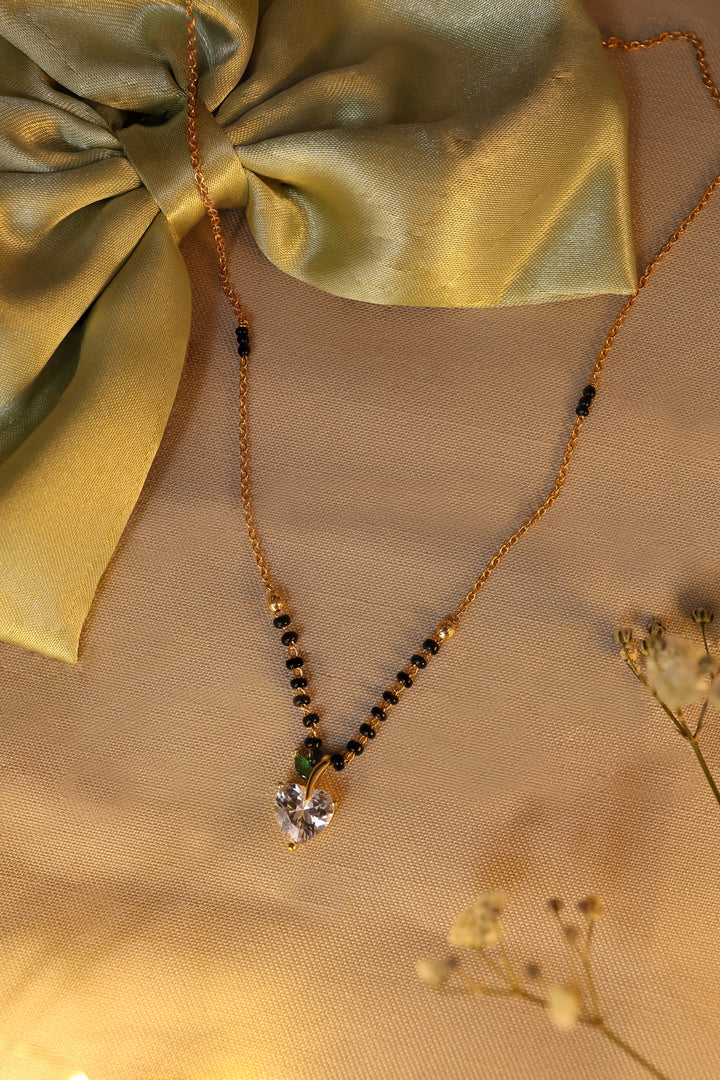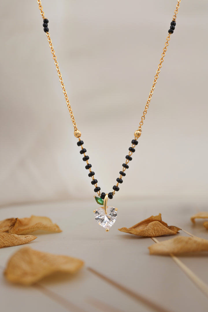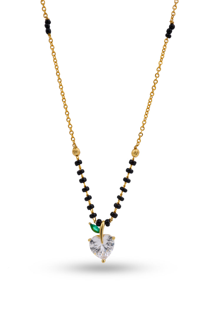 A cute and elegant mangalsutra featuring a sparkling heart-shaped CZ stone designed like a mini apple with a green leaf accent. Paired with glossy black beads and an 20K gold-plated chain, this charming piece adds a fresh, youthful touch to everyday tradition. Perfect for daily wear and gifting