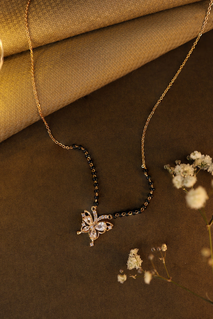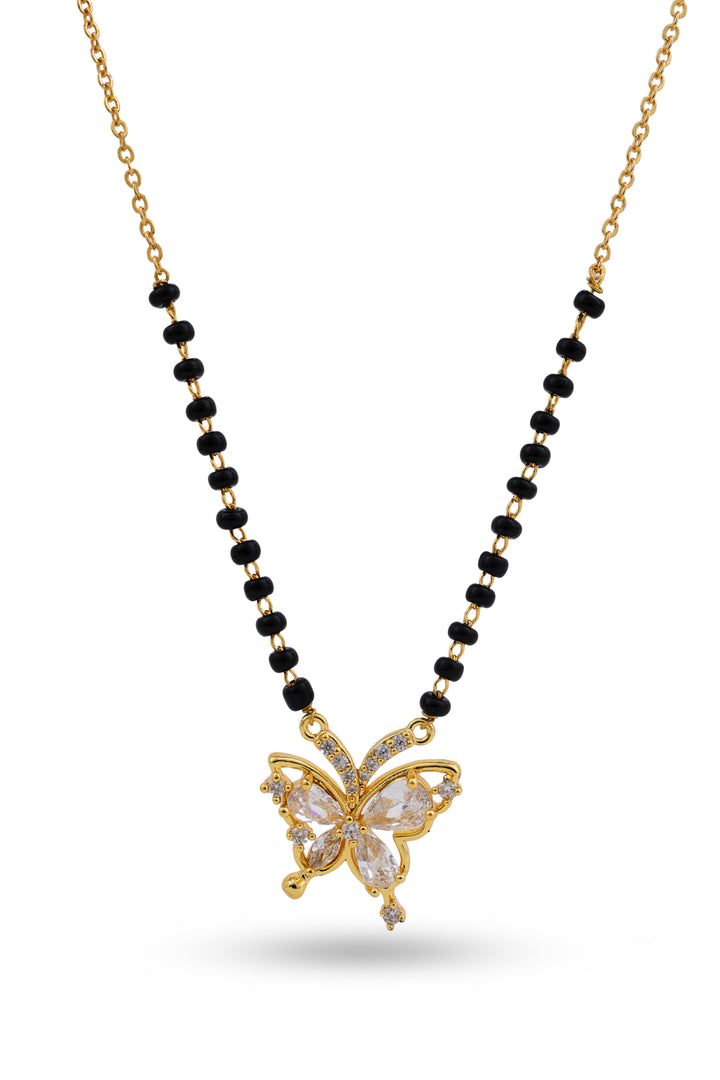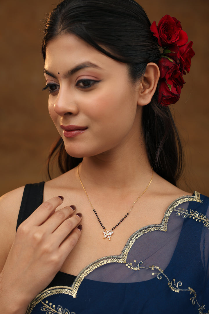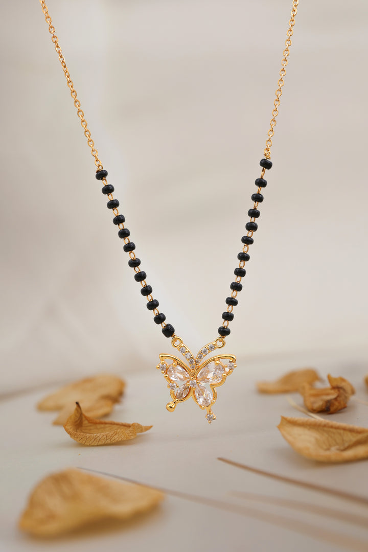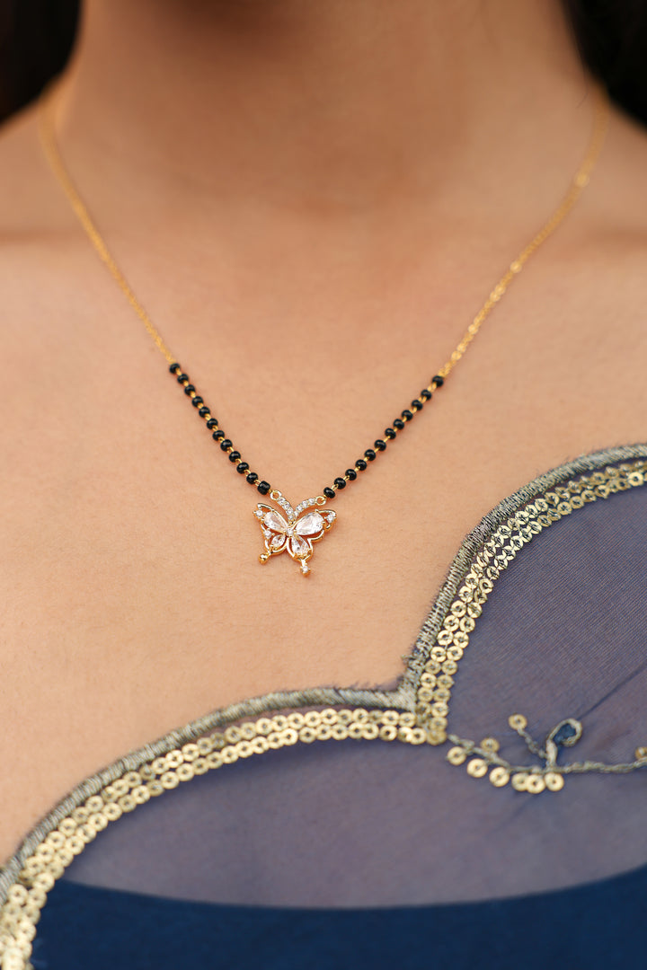 A charming butterfly mangalsutra featuring sparkling crystal wings set in an elegant 20K gold-plated frame. Paired with glossy black beads, this delicate and feminine design brings a touch of grace and beauty to everyday traditional wear. Perfect for daily use and gifting.