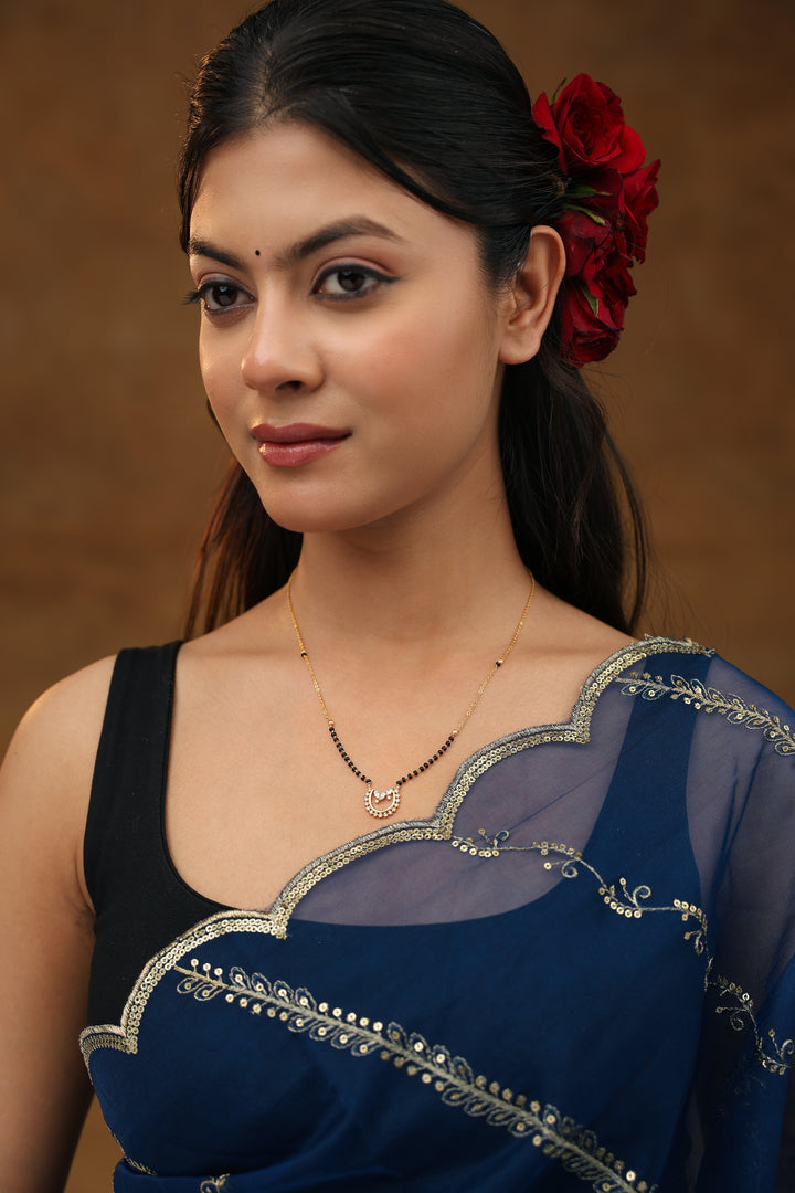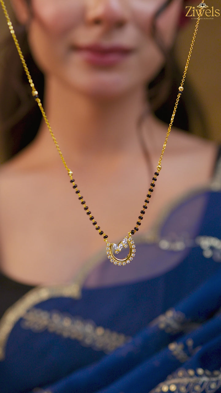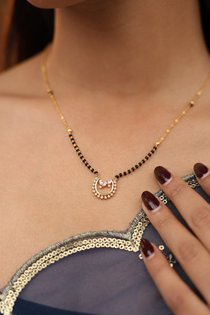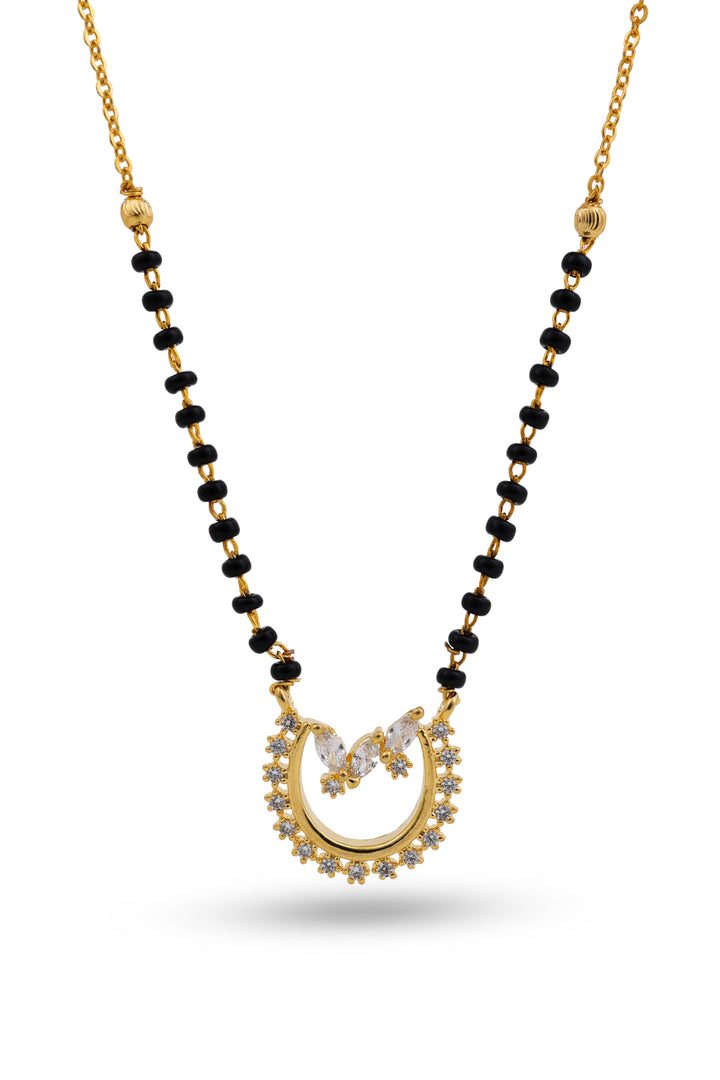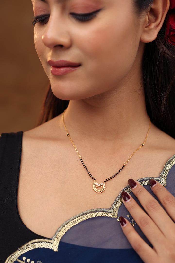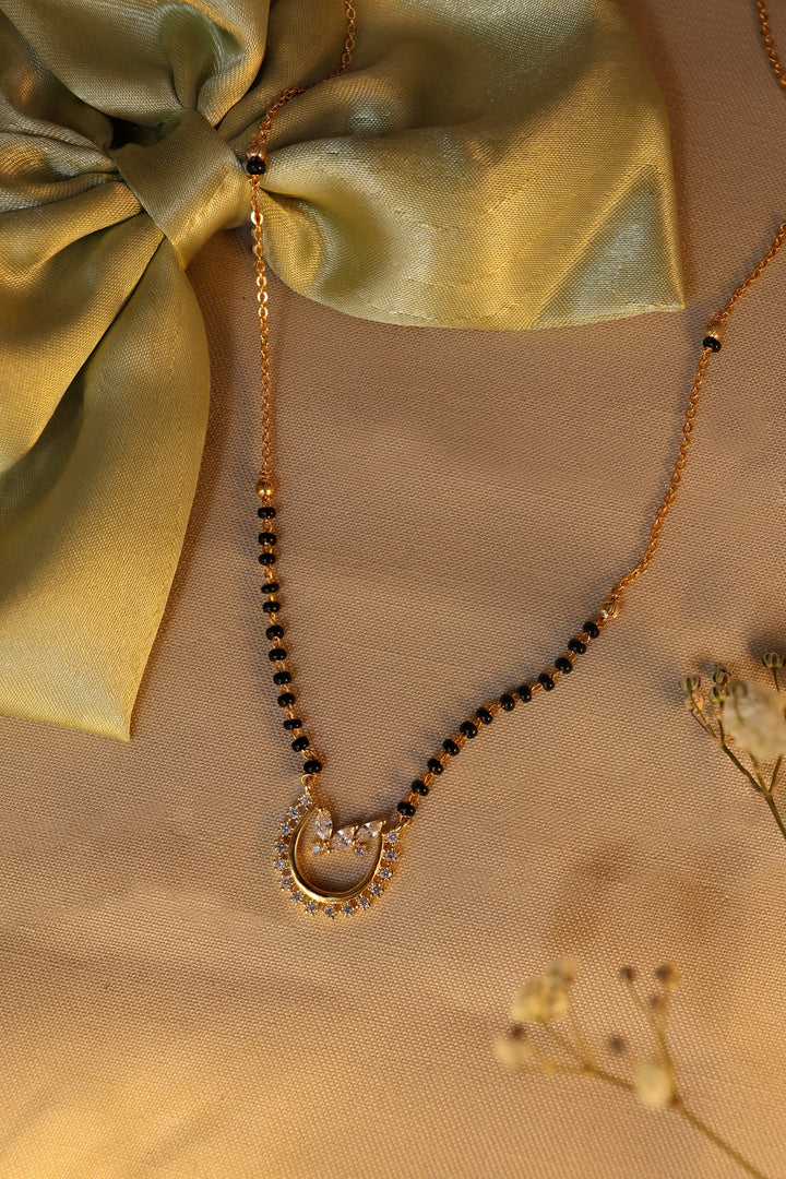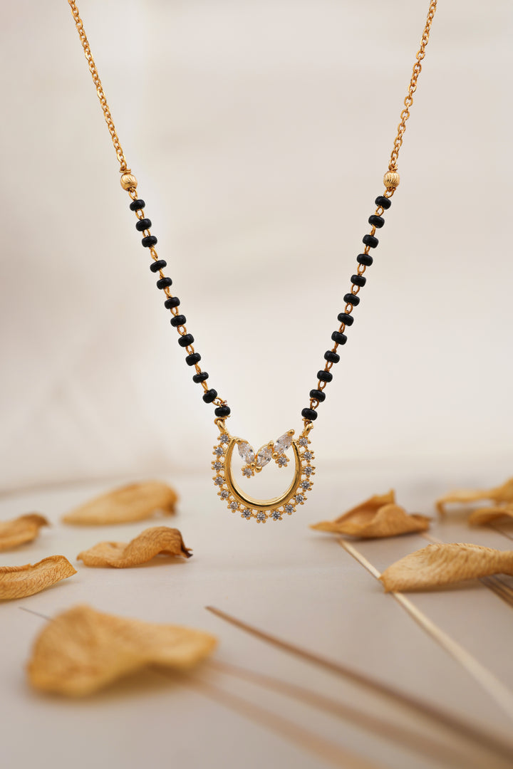 A stylish U-shaped mangalsutra adorned with sparkling CZ stones and topped with delicate marquise crystals. Paired with classic black beads and an 20K gold-plated chain, this modern and graceful design adds a touch of luxury to everyday traditional wear. Perfect for daily elegance and gifting