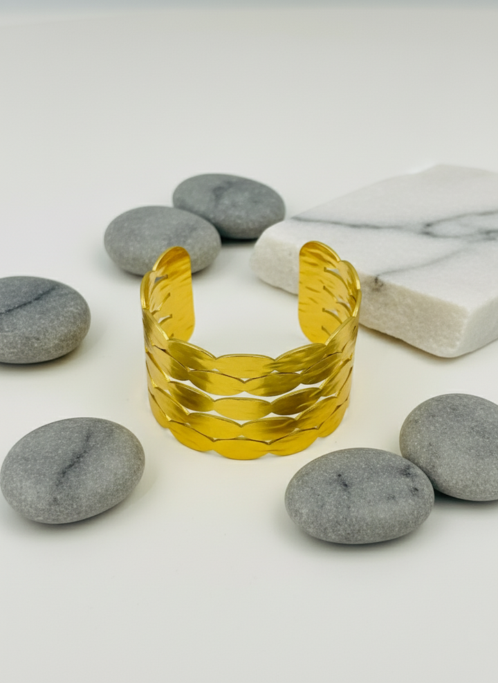Crafted from premium stainless steel and finished with 18K gold plating, this bracelet is anti-tarnish, waterproof, and hypoallergenic, making it durable and comfortable for everyday or occasion wear. With its intricate overlapping braid design, it stands out as a statement piece for parties, weddings, and festive looks.