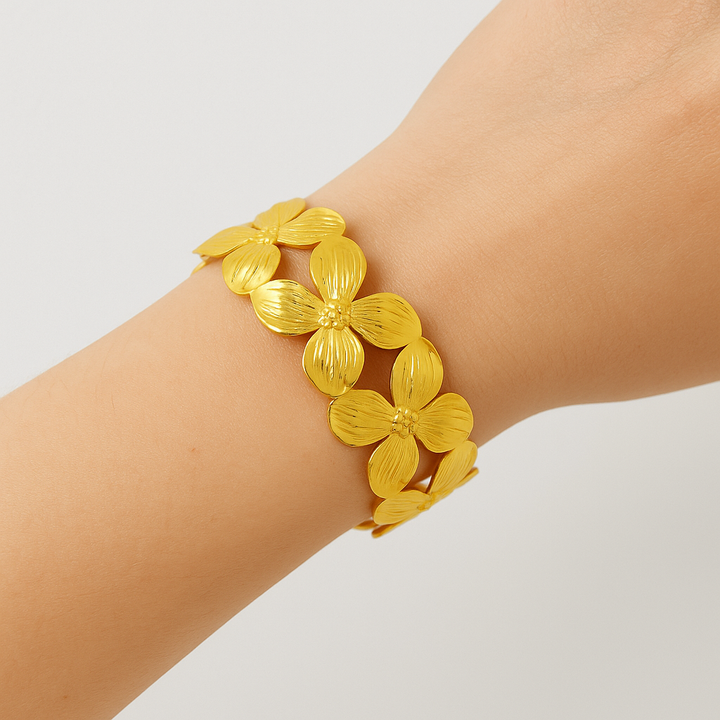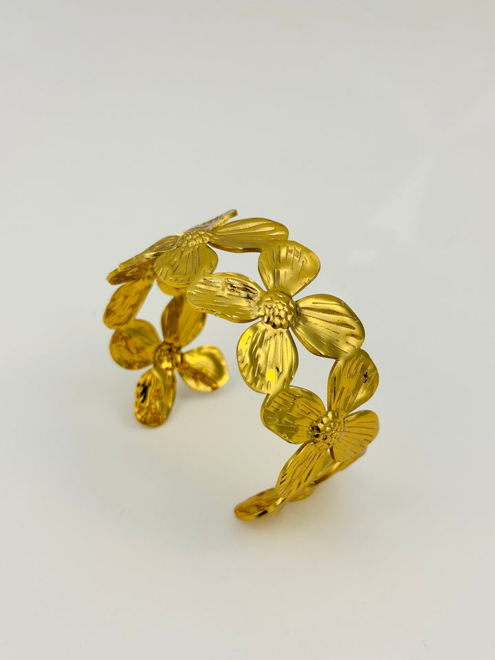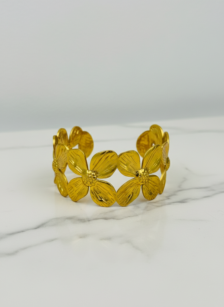 Crafted from premium stainless steel and plated in 18K gold, this bracelet is anti-tarnish, waterproof, and hypoallergenic, making it as durable as it is beautiful. The open-ended cuff style ensures a comfortable fit, while the intricate petal detailing adds texture and sophistication.