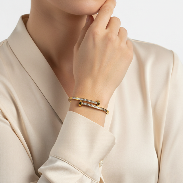 Designed for durability and everyday wear, this bangle is waterproof, anti-tarnish, and hypoallergenic, ensuring long-lasting shine and comfort. Its versatile style transitions seamlessly from day to night, making it perfect for weddings, festive occasions, office wear, or casual chic styling.
