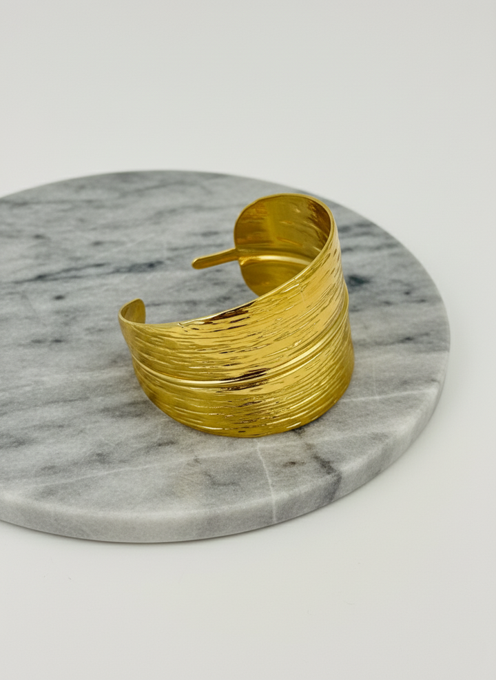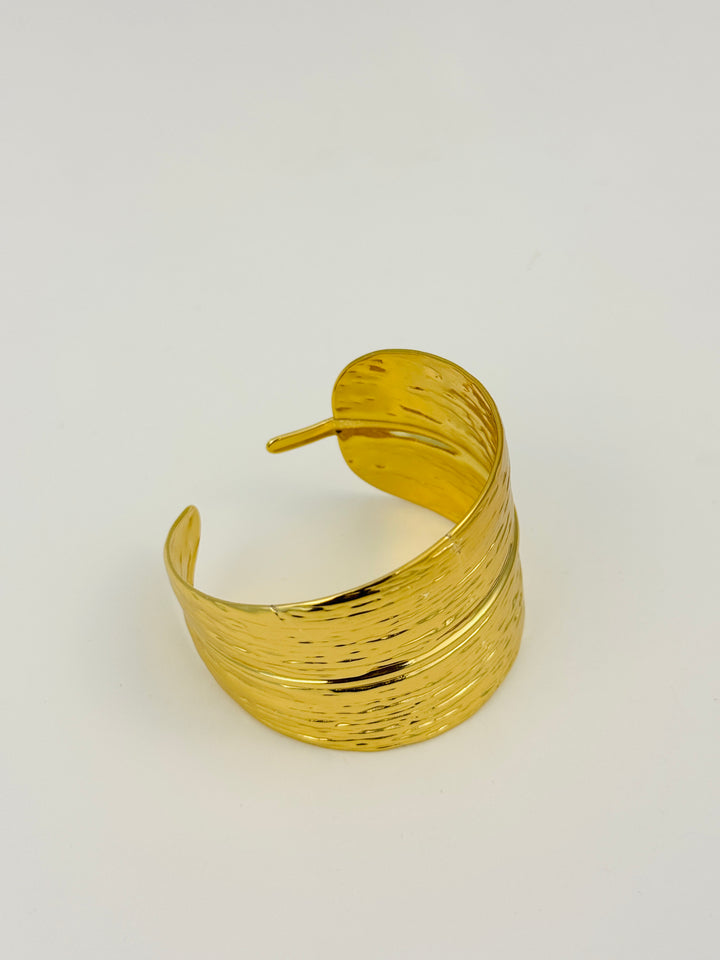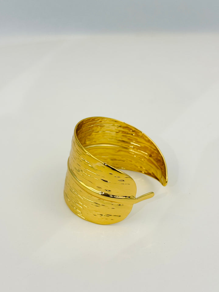 Design: Leaf-inspired textured wide cuff with overlapping ends