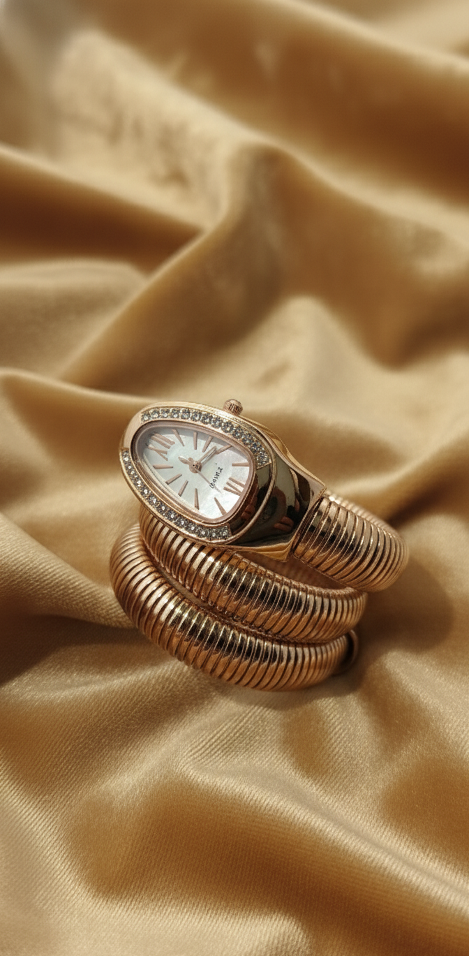 Step into the world of timeless luxury with the Ziwels Rose Gold Serpent Coil Watch, a masterpiece crafted for women who embrace elegance with bold confidence. This signature timepiece features the iconic serpent-inspired triple coil bracelet, wrapped in rich 18K rose gold plating, creating an effortlessly chic and glamorous statement look.