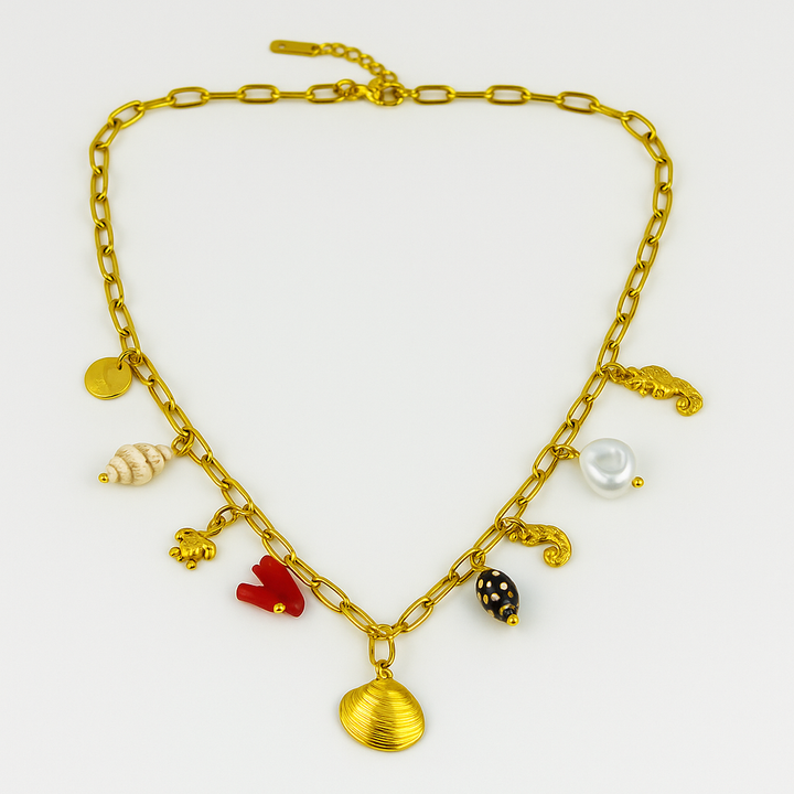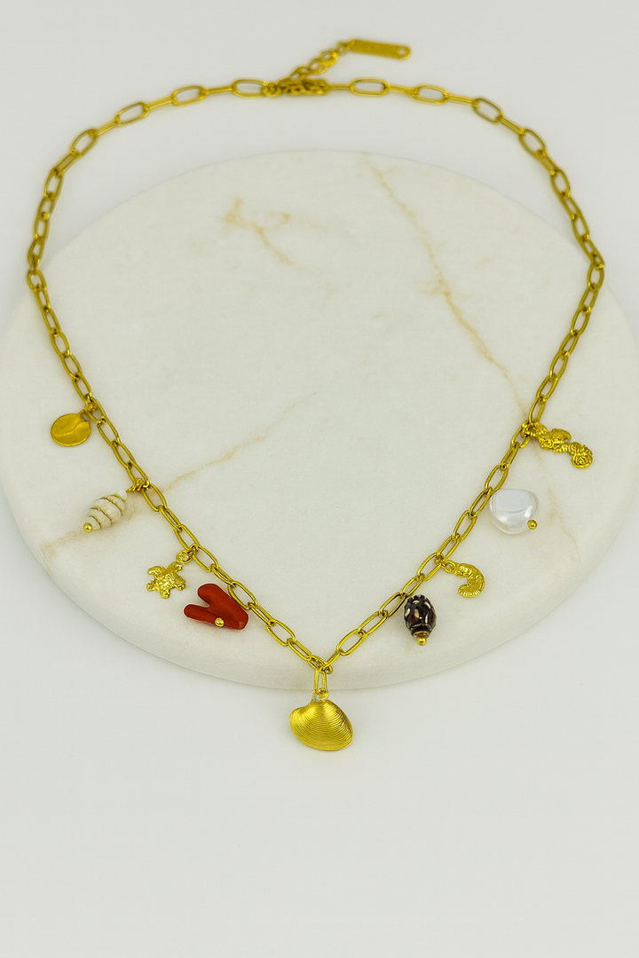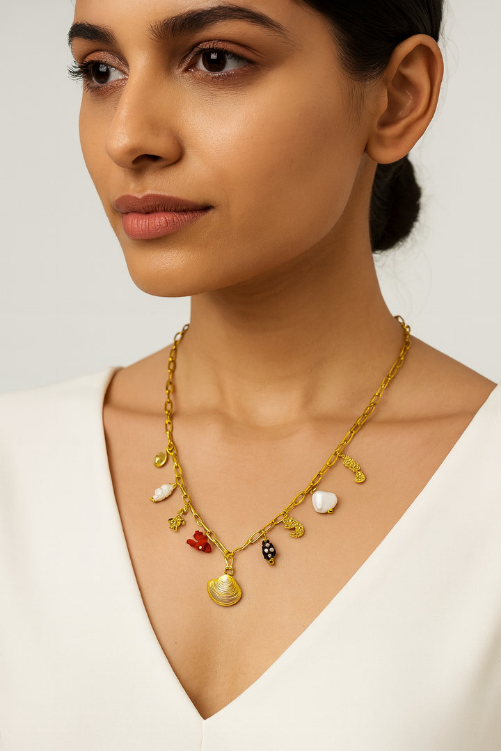 The Ziwels Seashell & Coral Charm Necklace is a vibrant, ocean-inspired piece designed to bring the beauty of the sea to your jewellery collection. Featuring a bold golden link chain, it is adorned with playful charms including seashells, coral motifs, pearls, and a textured gold seashell pendant at the center. This unique design captures the spirit of summer and luxury, making it the perfect statement accessory.