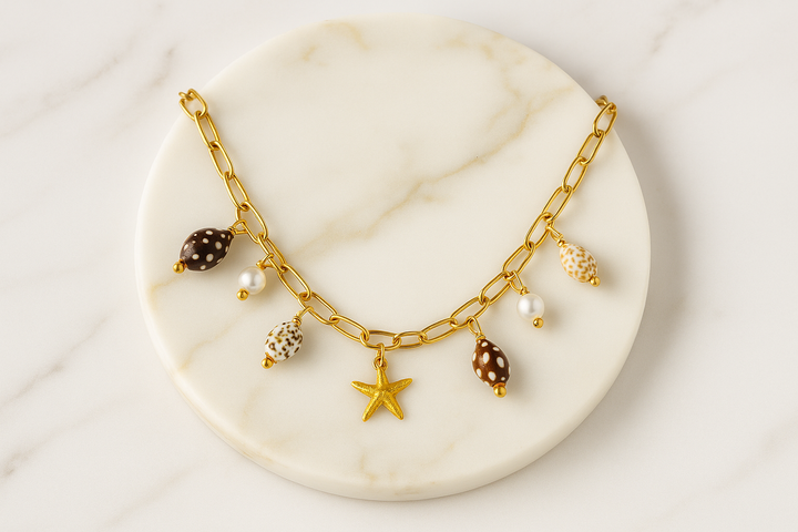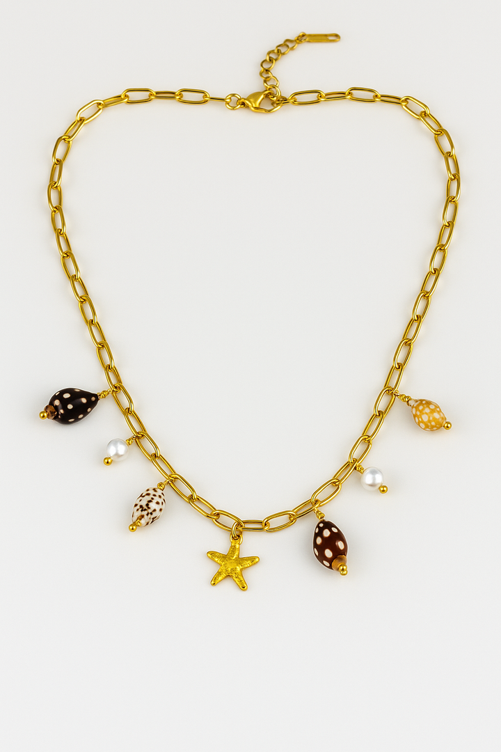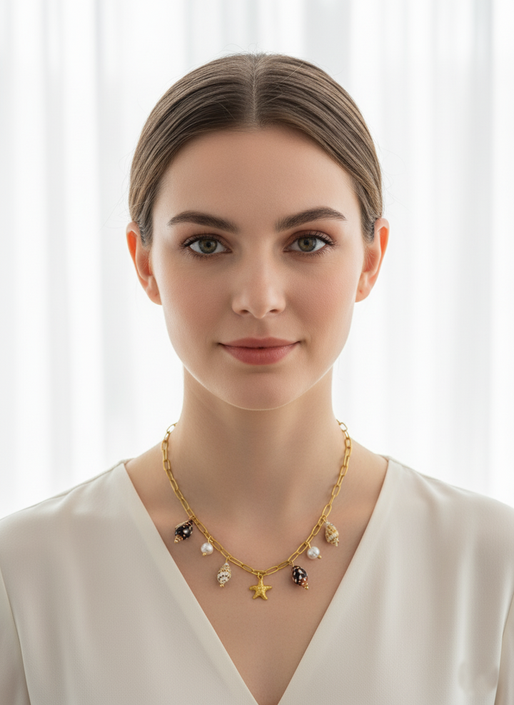 The Ziwels Seashell & Starfish Charm Necklace is a statement piece inspired by the treasures of the sea. Crafted with a bold gold link chain, it features a mix of natural seashell charms, lustrous pearls, and a golden starfish pendant that bring an ocean-inspired elegance to your look.