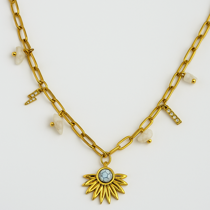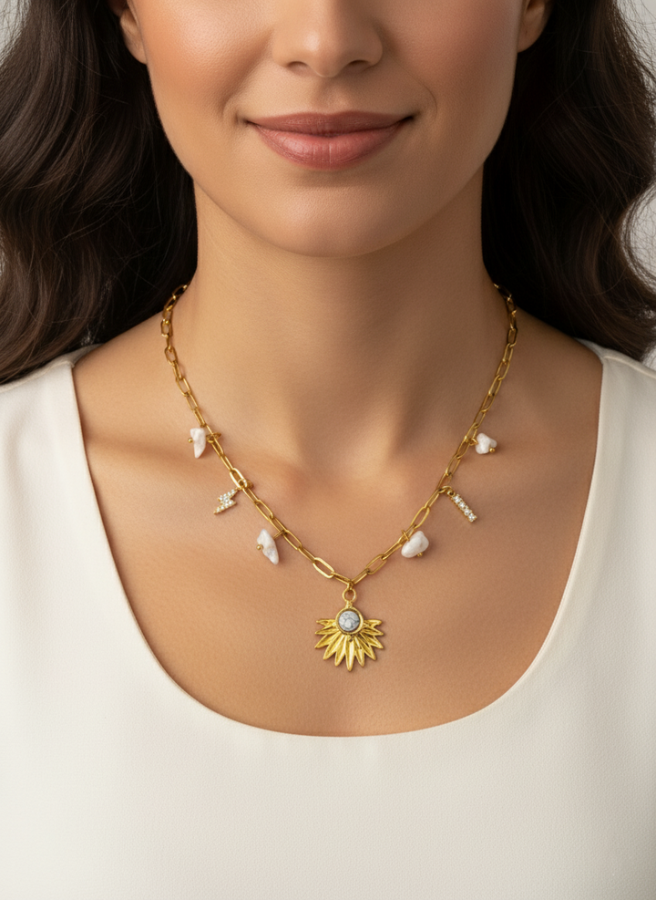The Ziwels Sunburst Pendant Charm Necklace is a radiant piece designed to shine with your every look. Featuring a bold golden link chain, it is beautifully accented with unique charms including natural stone beads, crystal-studded mini pendants, and a striking sunburst centerpiece with a gemstone detail. This necklace captures elegance, power, and modern sophistication in one timeless design.