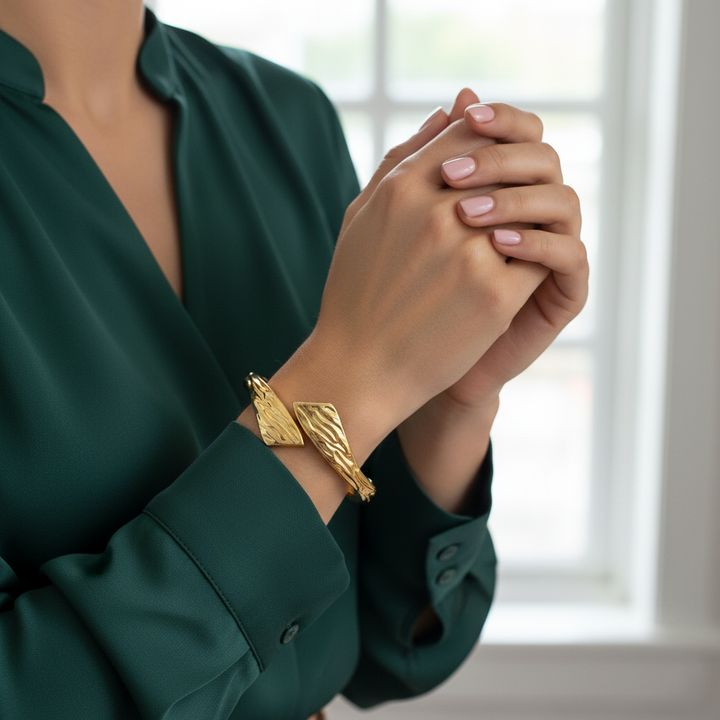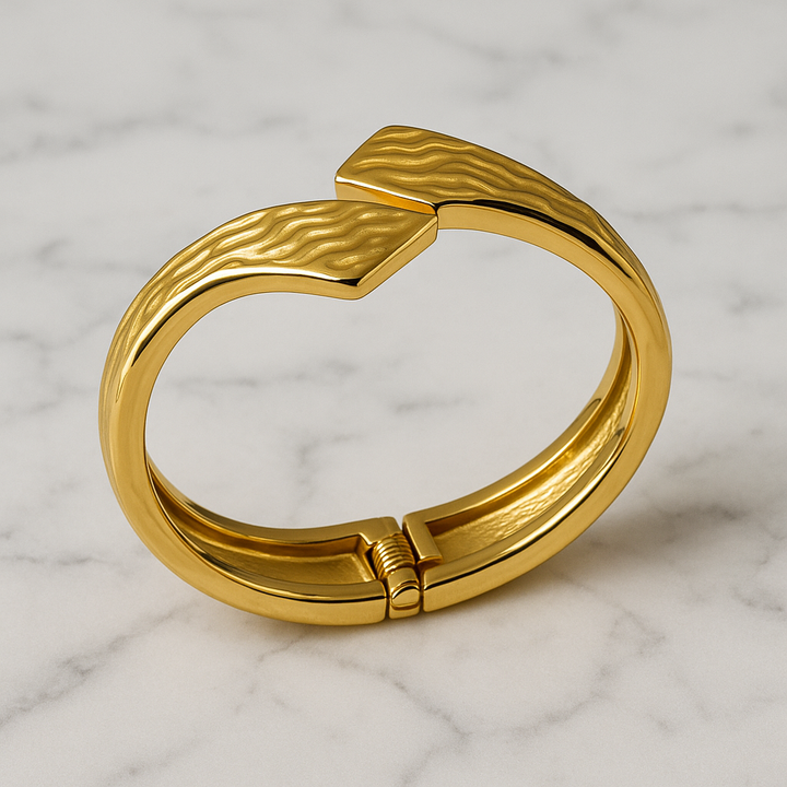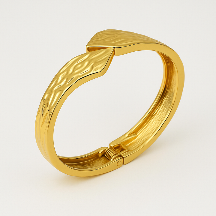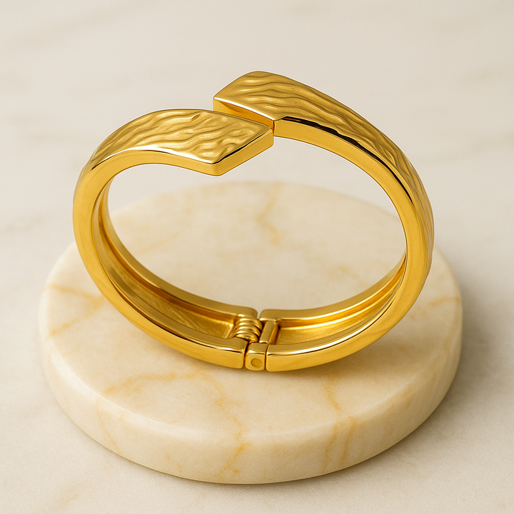Step into timeless elegance with the Ziwels Diamond-Cut Textured Gold Bracelet, a perfect fusion of bold design and modern craftsmanship. This premium bracelet is crafted from high-quality stainless steel with 18K gold plating and features a sharp angular open- design with diamond-cut textured patterns, giving it a luxurious, statement look.