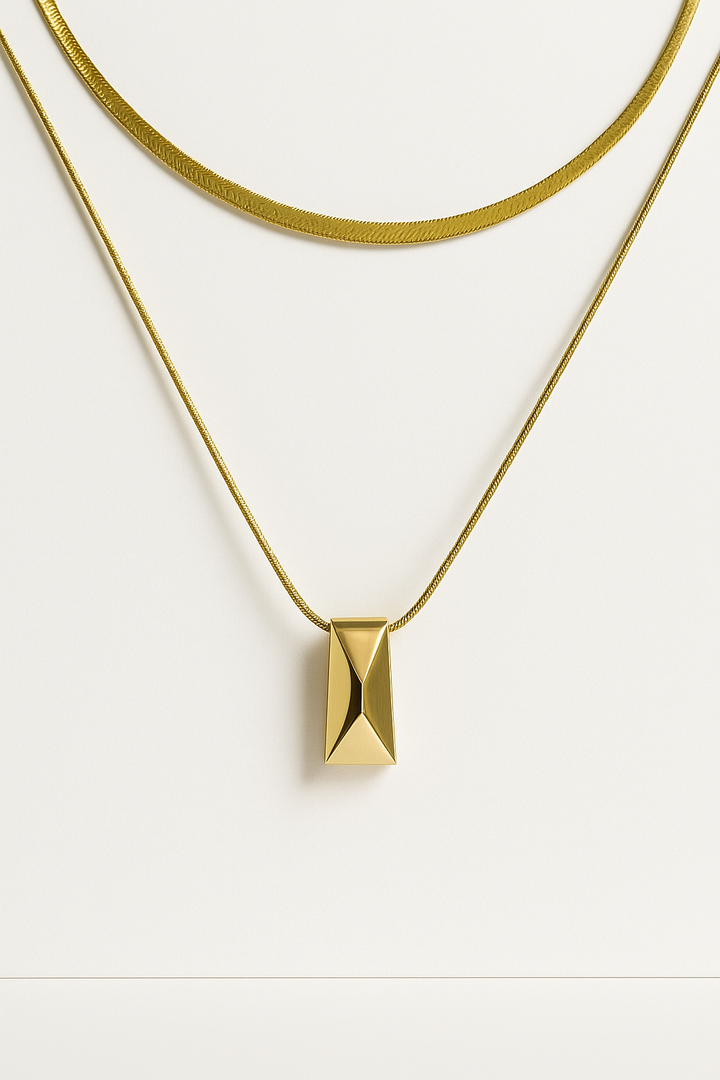 This dual-layer design pairs a sleek herringbone chain with a fine link chain, showcasing a unique pyramid-bar pendant that reflects light from every angle.