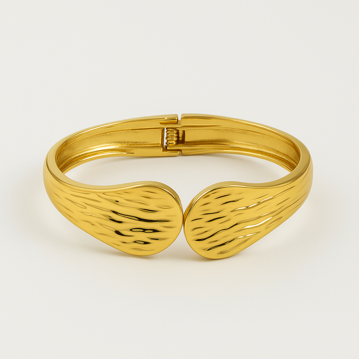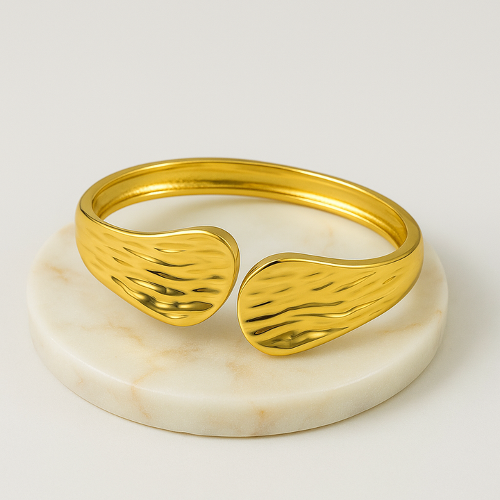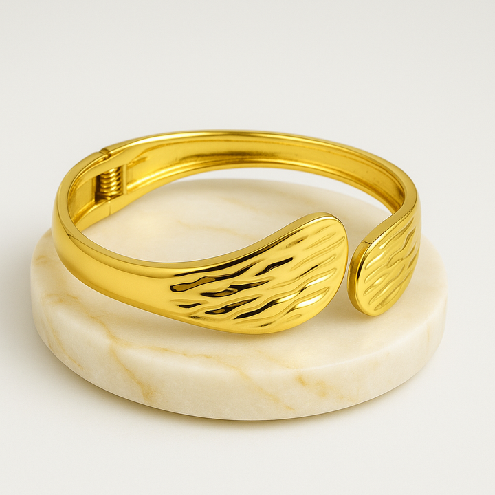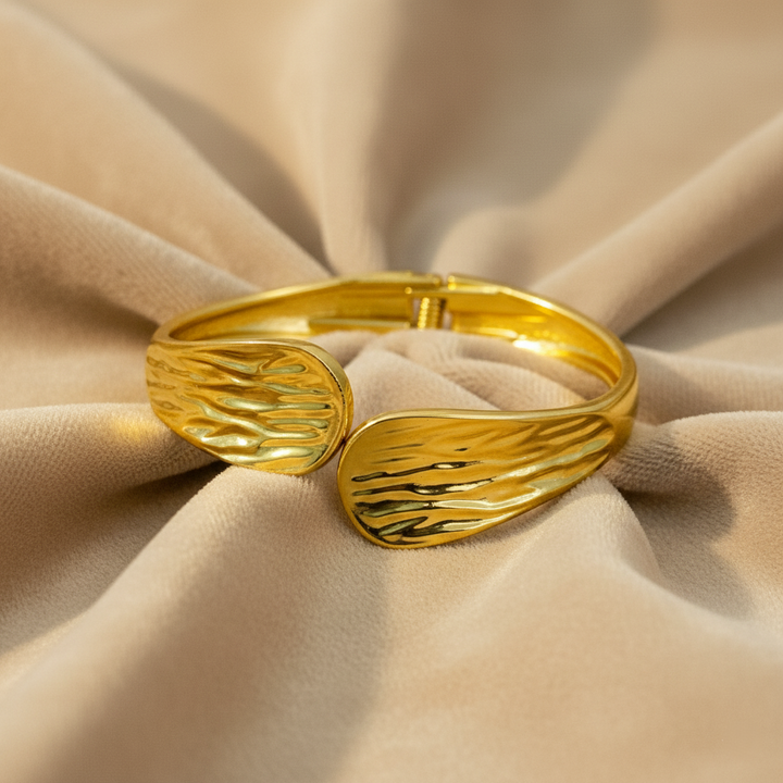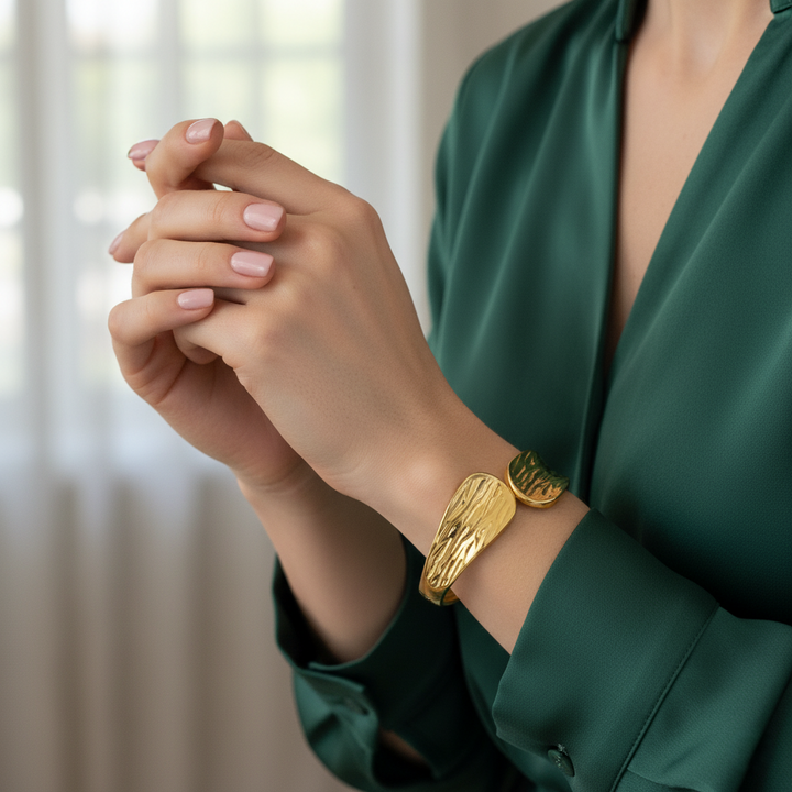 Engineered for both durability and elegance, this bracelet is anti-tarnish, waterproof, and hypoallergenic, ensuring long-lasting wear without compromising on comfort. With its artistic hammered-style finish and secure hinge clasp, it’s perfect for everyday luxury, festive events, or statement styling.