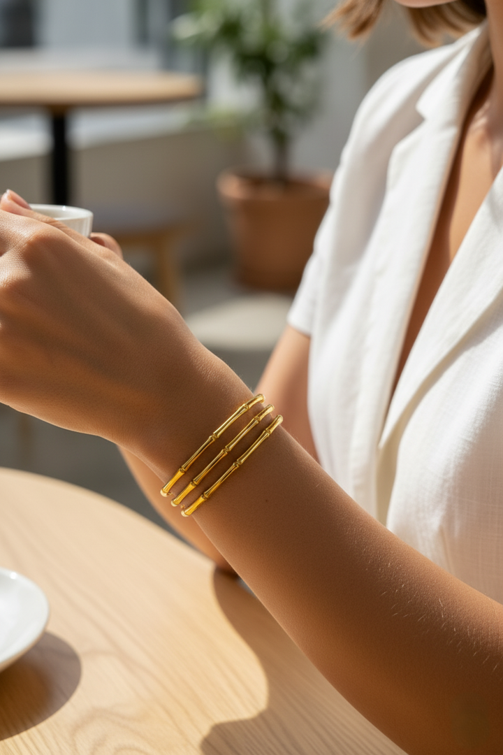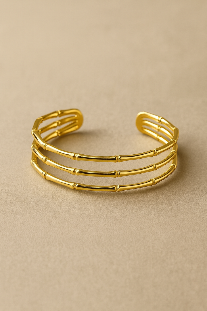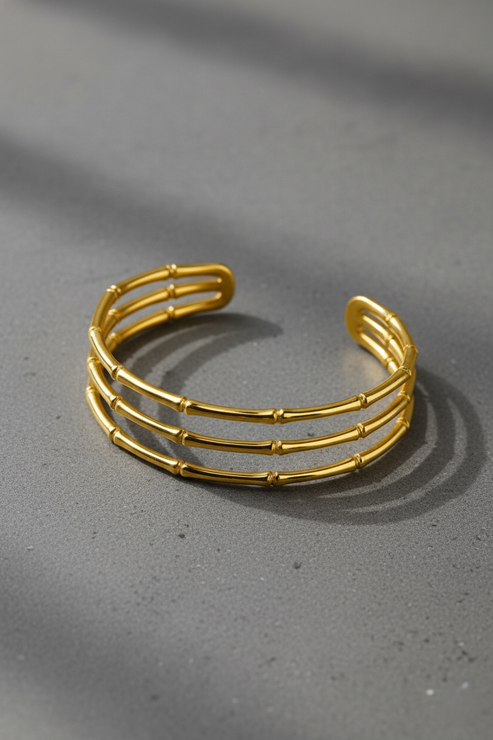 Crafted from premium stainless steel and coated with 18K gold plating, this bracelet features a three-bar open cuff design that’s sleek, structured, and effortlessly chic.