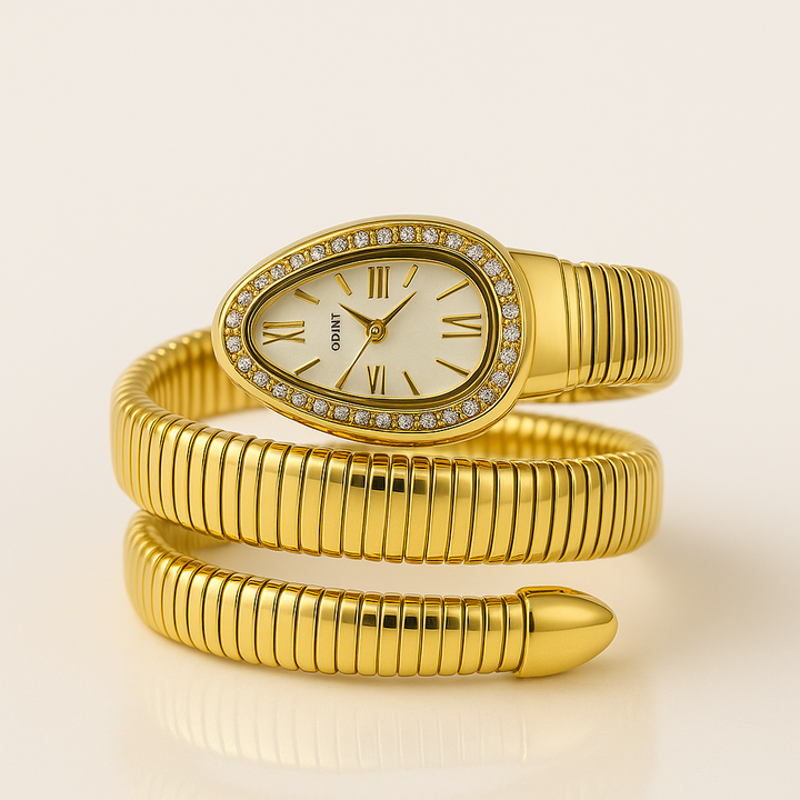 The serpent-inspired structure exudes power and femininity, while the oval crystal-studded dial adds a touch of timeless luxury.