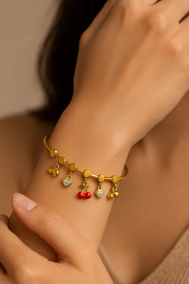 Bring a playful yet elegant touch to your jewellery collection with the Ziwels Women’s Cherry Charm Bracelet. This stylish open bangle features a sleek 18K gold-plated stainless steel band decorated with adorable dangling charms — including cherries, crystal-studded hearts, and golden accents. At the center, a vibrant red enamel cherry charm adds a pop of color, making this bracelet stand out with youthful charm and sophistication.