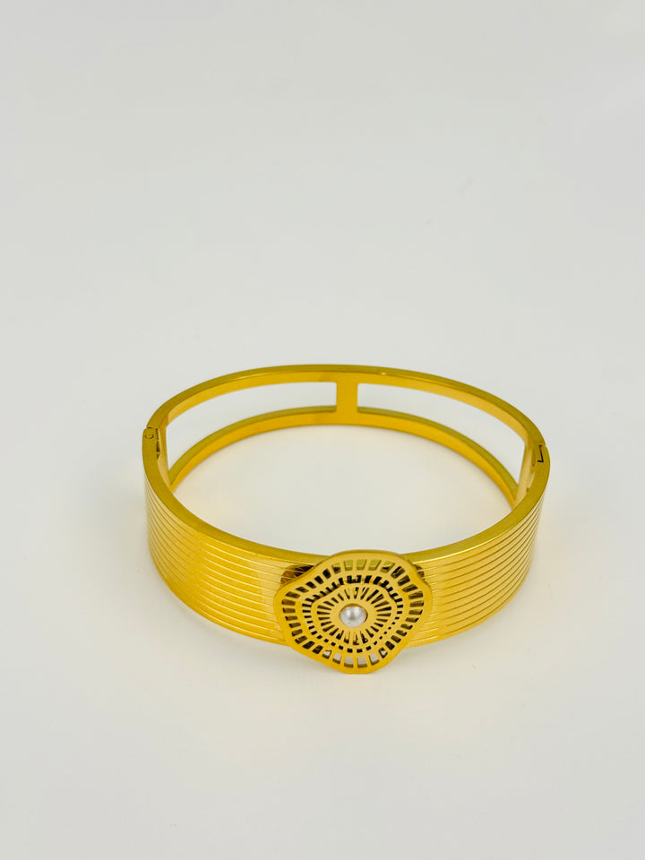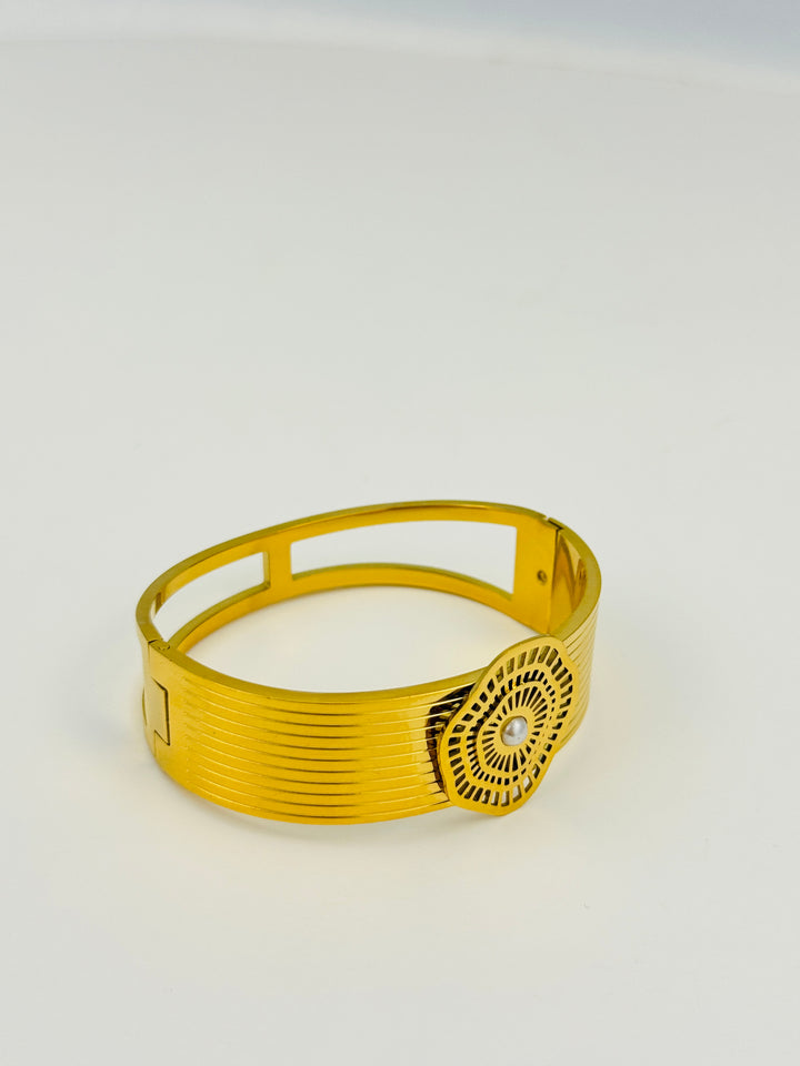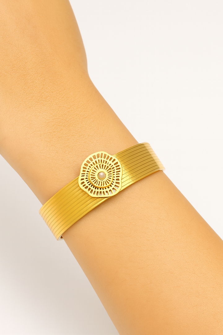 Crafted from premium stainless steel with 18K gold plating, this bracelet is anti-tarnish, waterproof, and hypoallergenic, ensuring durability and long-lasting shine. Its bold yet refined design makes it a versatile piece that transitions effortlessly from daily wear to festive occasions.