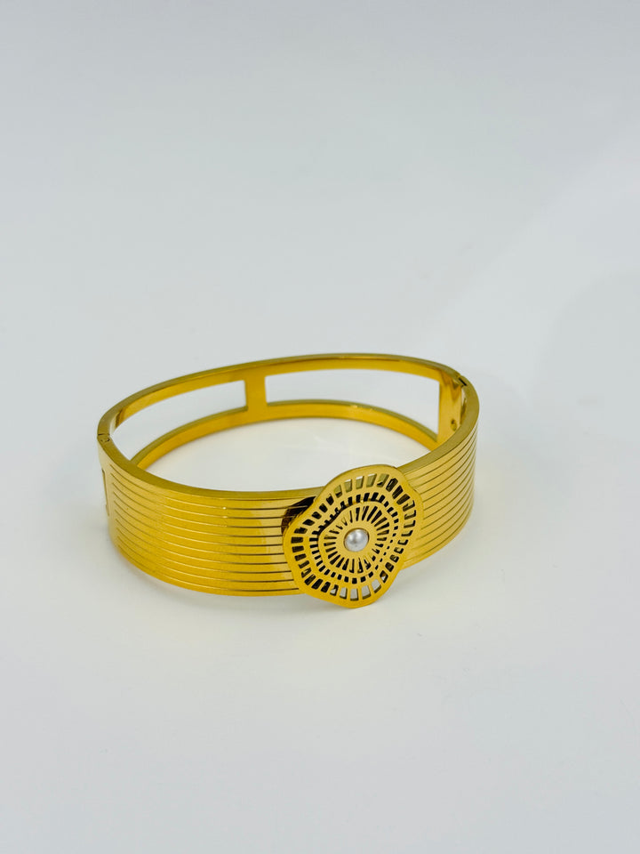 Add timeless sophistication to your jewellery collection with the Ziwels Women’s Floral Pearl Cuff Bracelet, designed for women who appreciate both elegance and strength. This wide cuff bangle features a beautifully carved floral motif with a lustrous pearl at its center, set against a textured gold finish for a regal appeal.