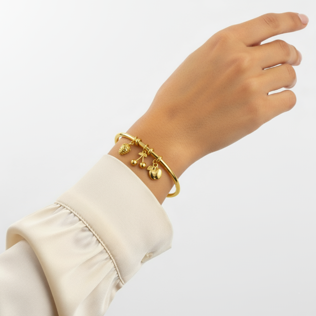 Add a playful yet elegant touch to your style with the Ziwels Women’s Fruit Charm Bracelet, a chic bangle designed for women who love unique statement jewellery. This bracelet features three charming fruit motifs — a detailed strawberry, a pair of cherries, and a polished apple charm, each symbolizing sweetness, vitality, and joy.