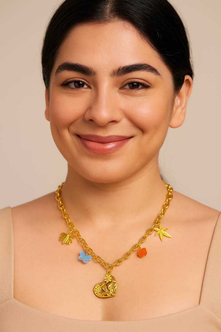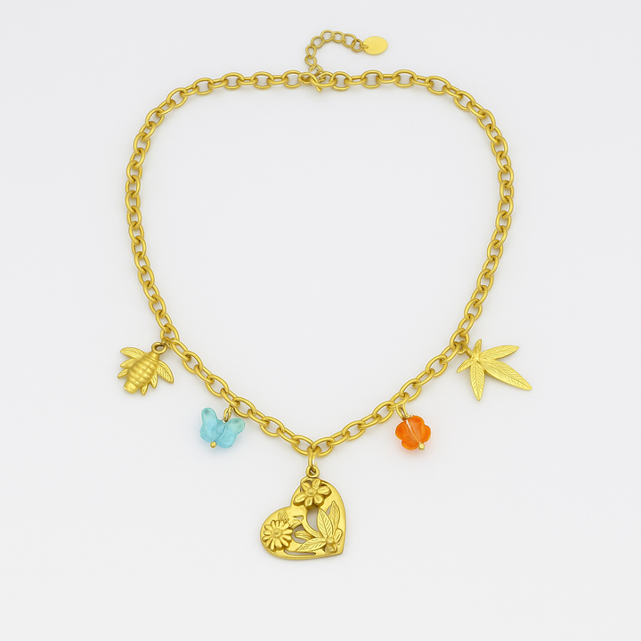 Ziwels Women’s Heart Charm Necklace – 18K Gold Plated Chain with Butterfly, Bee & Floral Motifs | Anti-Tarnish, Waterproof, Stainless Steel