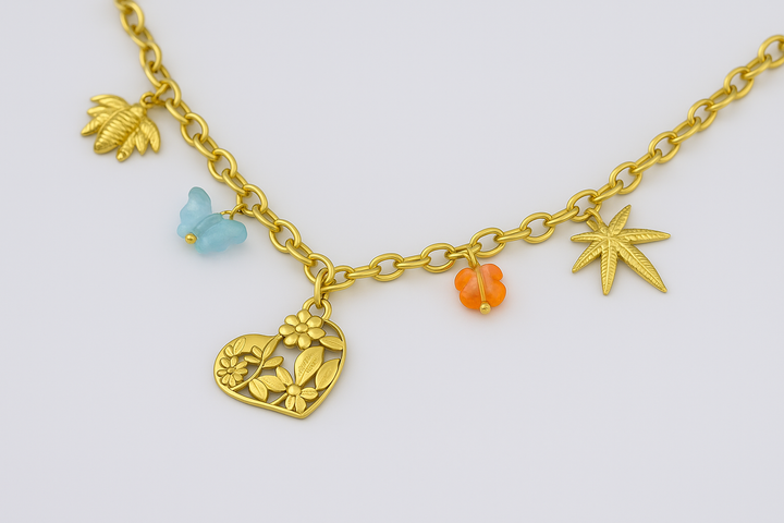 Charms: Heart pendant, bee, butterfly, leaf & gemstone-style beads