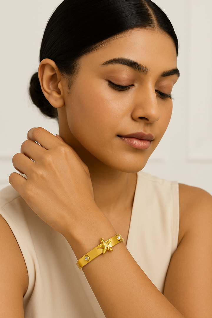 Crafted from premium stainless steel and finished with 18K gold plating, this bracelet is anti-tarnish, waterproof, and hypoallergenic, ensuring lasting brilliance and durability. Its minimalist yet statement-making design makes it versatile for daily wear, beach-inspired looks, festive occasions, or gifting.